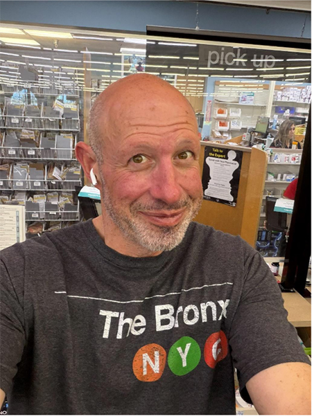 Last week Dave was in the pharmacy line at CVS. His daughter Anya, a high school junior, was on a spring break college tour and called him from Fordham. Dave happened to be wearing a T-shirt that said The Bronx and took this selfie to send to Anya:
